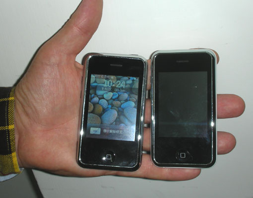 iPhone knock-offs info TV commericals are hitting Shenzhen. Offering a cheaper iPhone. This is China but I did not expect to see this on TV. Must be inprepartion for the China iPhone launch.